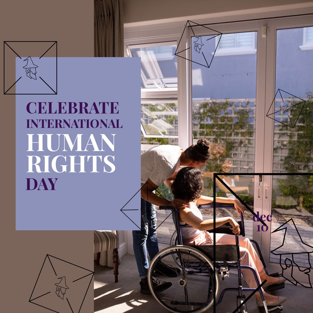 A woman in a wheelchair is next to another individual who is showing supportive engagement near large windows. This visual expresses themes of inclusion, empowerment, and accessibility, celebrated on International Human Rights Day. Suitable for campaigns promoting inclusion and awareness for human rights, educational materials, and social media posts elevating disability pride and togetherness.