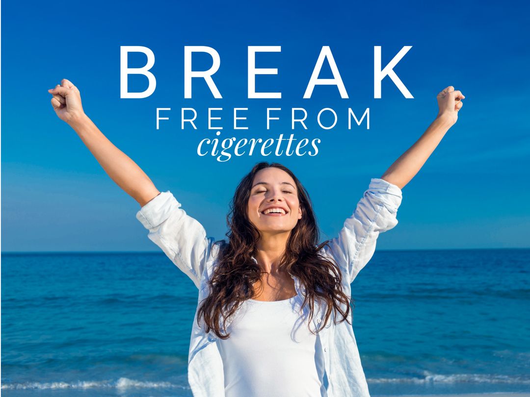 Depicts a joyful woman lifting her arms in celebration on a sunny beach, symbolizing liberation from smoking. Ideal for use in health and wellness campaigns, motivational content, or materials promoting healthy living and quitting smoking.