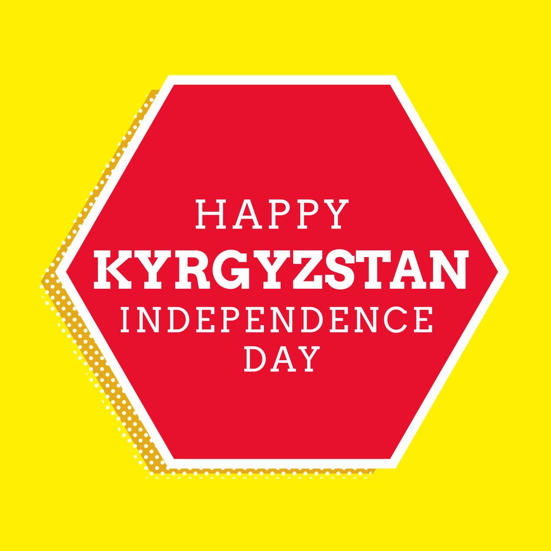 Illustration featuring a Kyrgyzstan Independence Day greeting set on a vibrant red hexagon against a bold yellow background. Ideal for festive announcements, social media posts, or promotional designs celebrating Kyrgyz national pride and freedom.