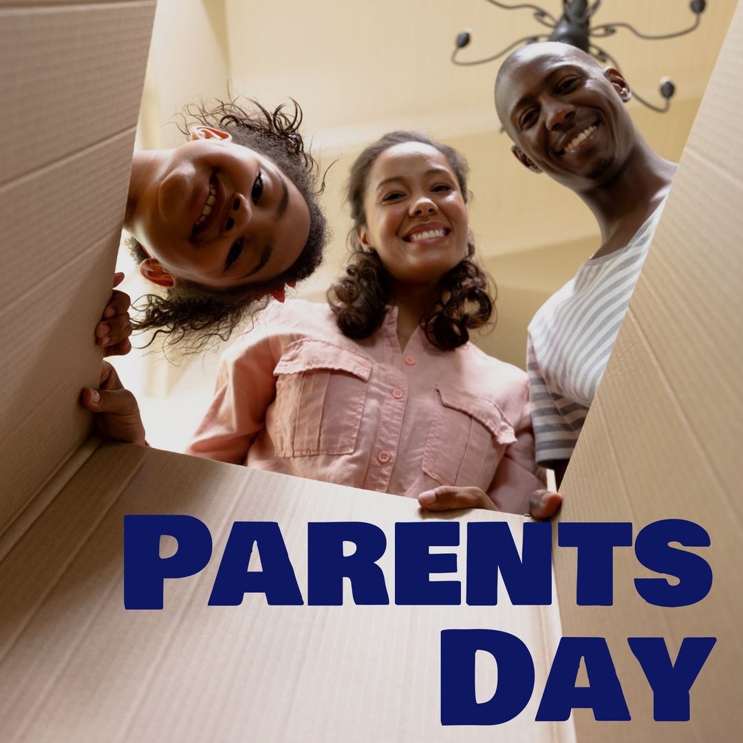 Family smiling and spending time together on Parents Day, looking down into virtual camera from inside a shipping box. Ideal for illustrating family unity, joy of parenthood, and celebratory emotions during family occasions. Perfect for event promotions and articles on family relationships.