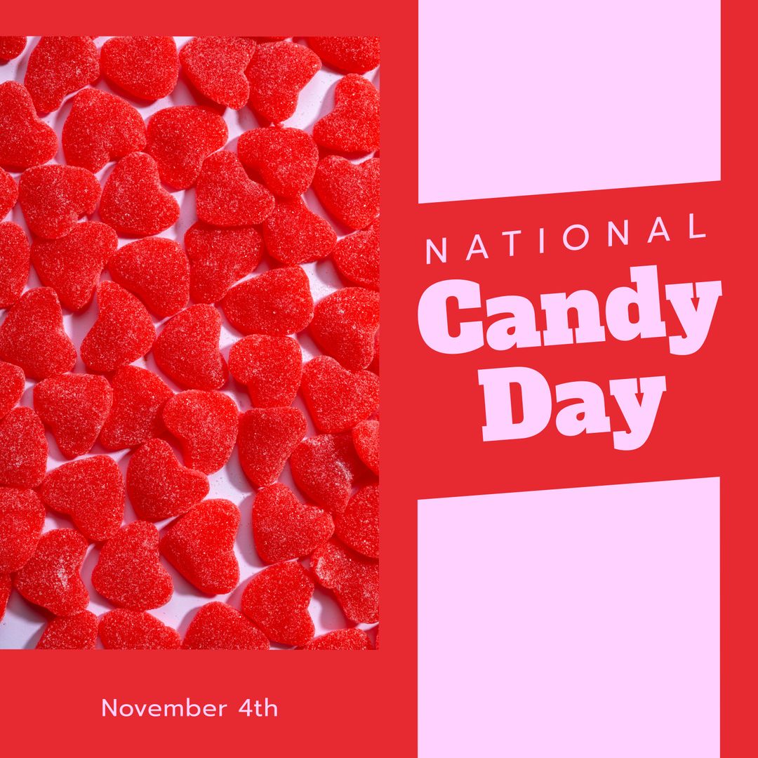 National Candy Day falls on November 4th each year and brings delight with a variety of candies. The vibrant image features numerous small, red, heart-shaped candies on display. This can be used for promoting candy-related events, creating an appealing social media post for the occasion, or inviting friends and family to enjoy some sweet treats on this special day.