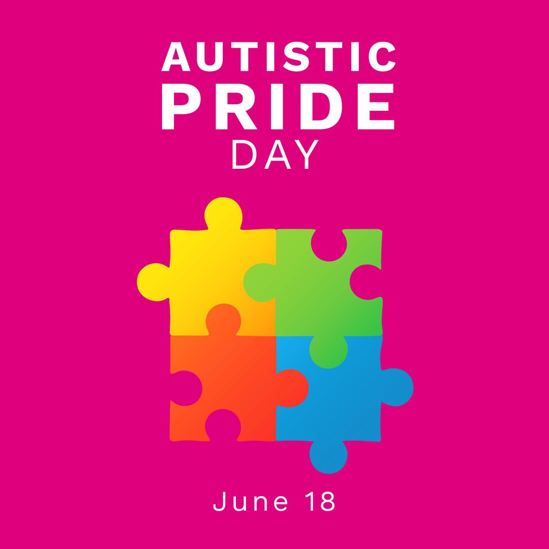 Bright, multicolored puzzle pieces symbolize unity and diversity in a celebratory design for Autistic Pride Day, set against a bold pink background. This is ideal for raising awareness and supporting autism communities during events on June 18, and for educational or promotional materials highlighting inclusivity and acceptance.