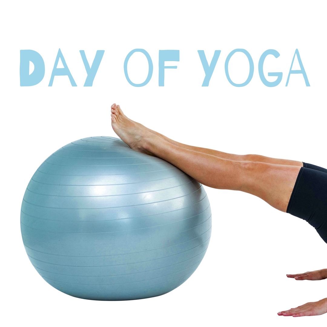 Composition featuring woman's legs balancing over a yoga ball with minimalist text 'Day of Yoga'. Reflects themes of fitness, balance, and well-being, making it ideal for promotional materials in the health and wellness industry. Useful for social media posts, wellness blogs, or advertisements aimed at promoting a holistic lifestyle.
