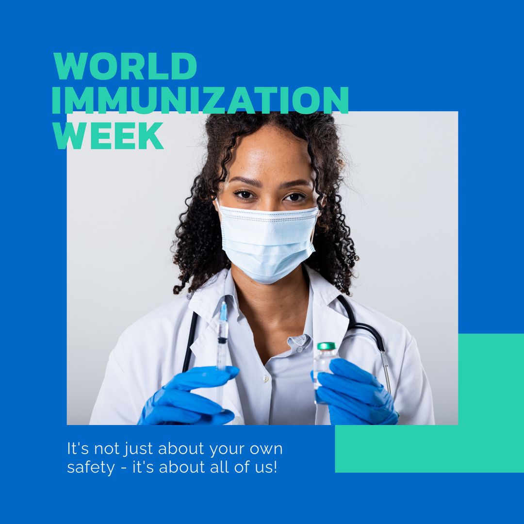 This image depicts a female doctor in uniform holding a syringe and vaccine, emphasizing the importance of healthcare and immunization during World Immunization Week. Her expression asserts professionalism and dedication, while also highlighting themes of safety and community health. The image could be used in healthcare campaigns, social media posts about vaccination awareness, public health announcements, or educational materials related to immunization and disease prevention.