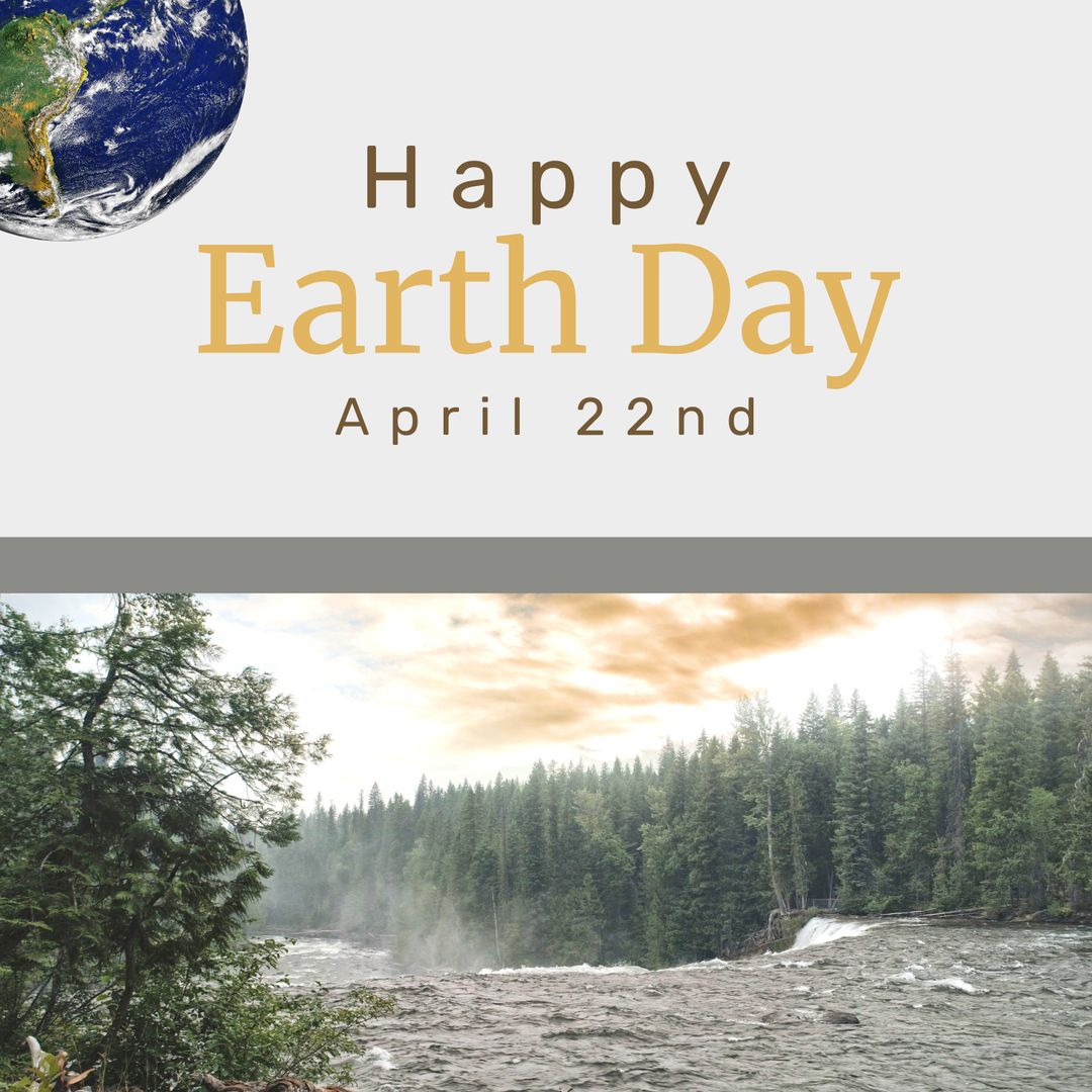 Design showcases beautiful river with surrounding pine forest, signifying importance of conserving, supporting Earth. Text emphasizes Earth Day on April 22nd, perfect for use in campaigns, promotions highlighting environmental protection, conservation efforts. Celebrates call to action for sustainability, appreciating natural beauty around us.