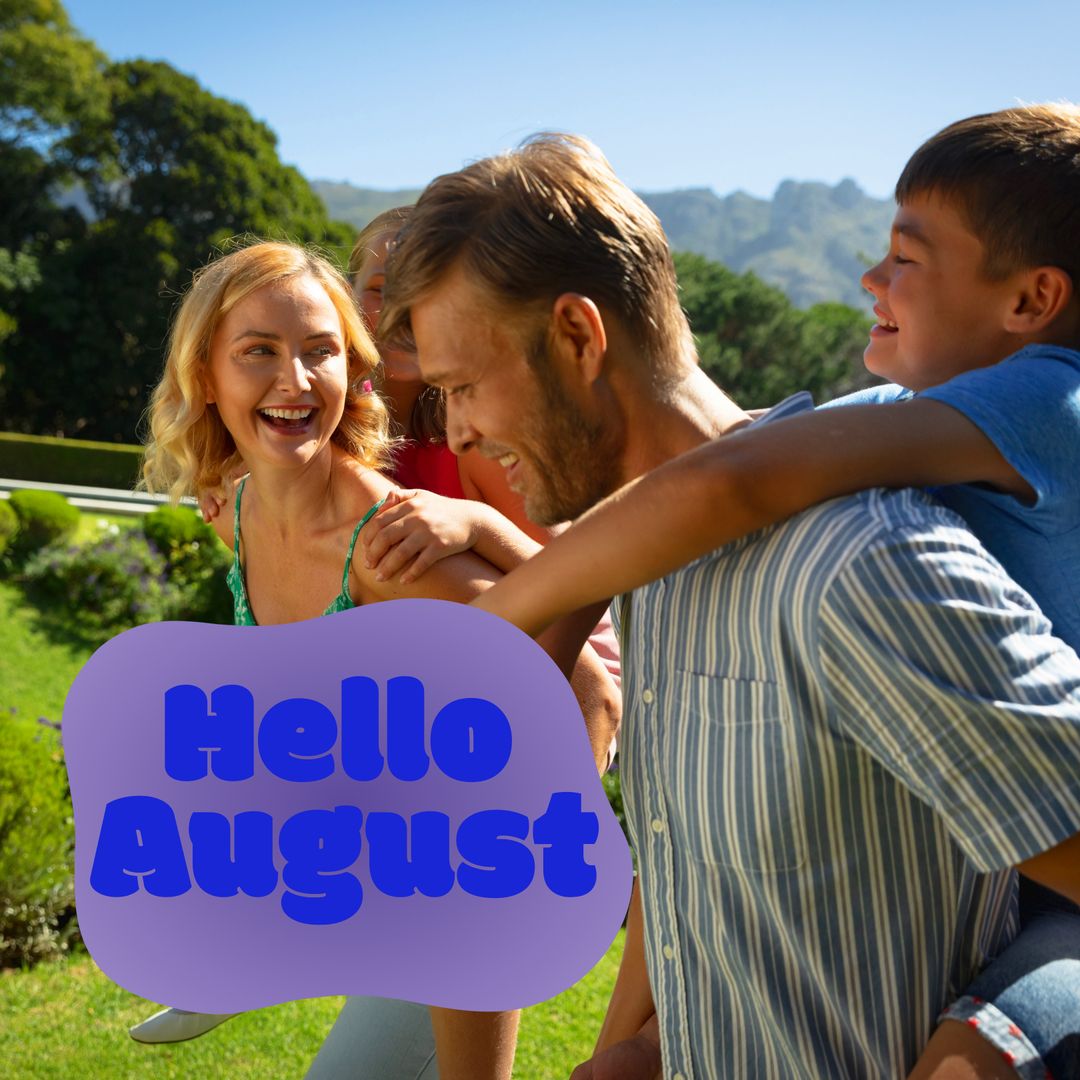 A cheerful family enjoying a sunny day in August, with parents giving piggyback rides to their children amidst vibrant greenery. This picture embodies summer joy and family bonding, suitable for use in marketing materials about vacations, family days out, or season-specific themes.