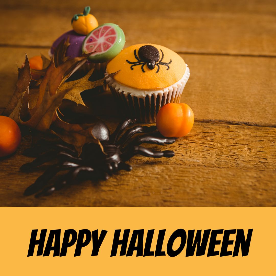 Arrangement of Halloween-themed cupcakes is adorned with autumn leaves and artificial spiders, set on rustic wooden surface. A perfect fit for Halloween-themed parties, invitations, and festive season promotions, the image captures spooky yet colorful essence of the holiday.
