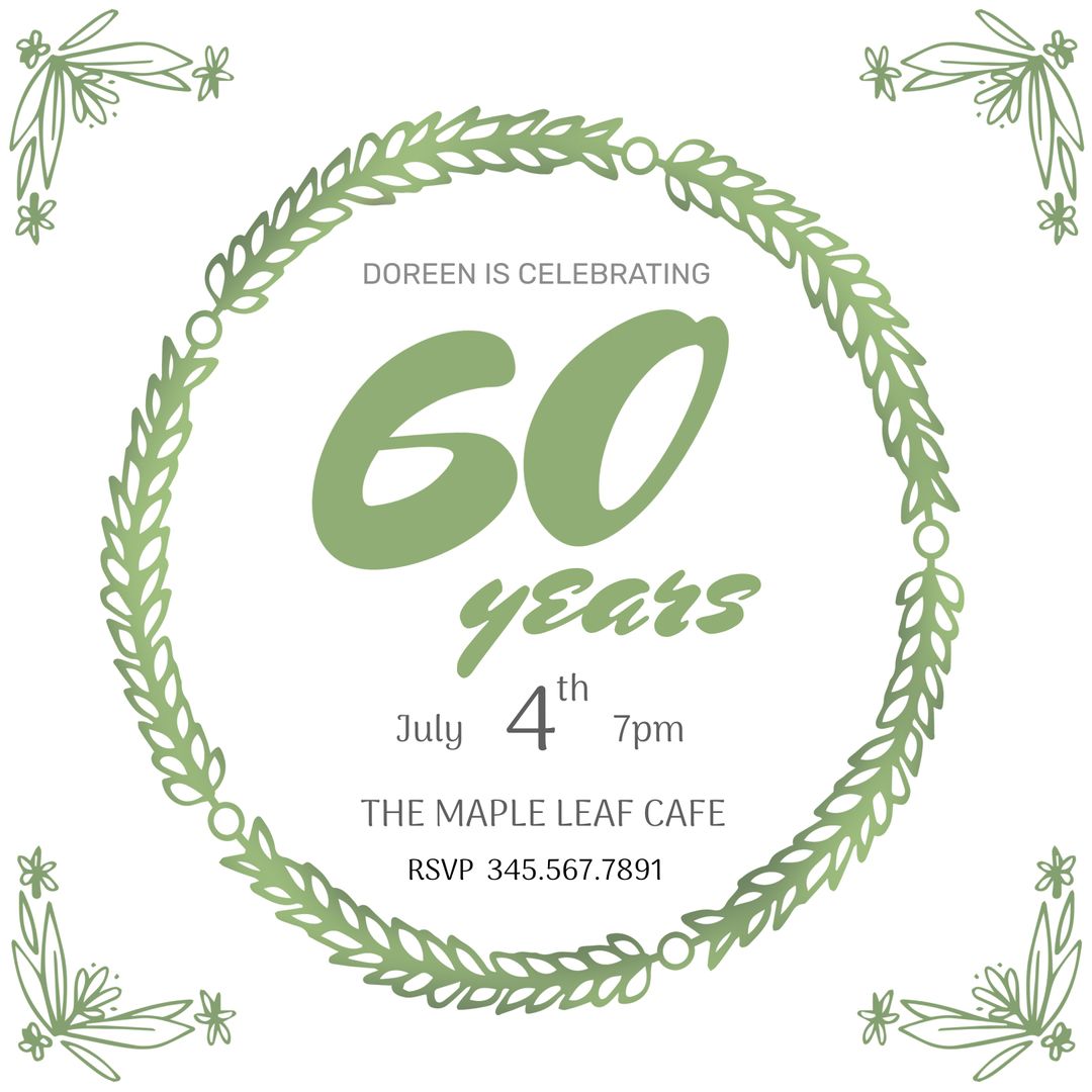 Leafy green wreath surrounding number 60 signifies growth and vitality, setting a jubilant tone for any aging-related celebration like a 60th anniversary. Warm woodland colors suit milestones emphasizing sustainability or eco-friendliness. Great for editable greeting cards or event invitations, highlighting 'years' and date.