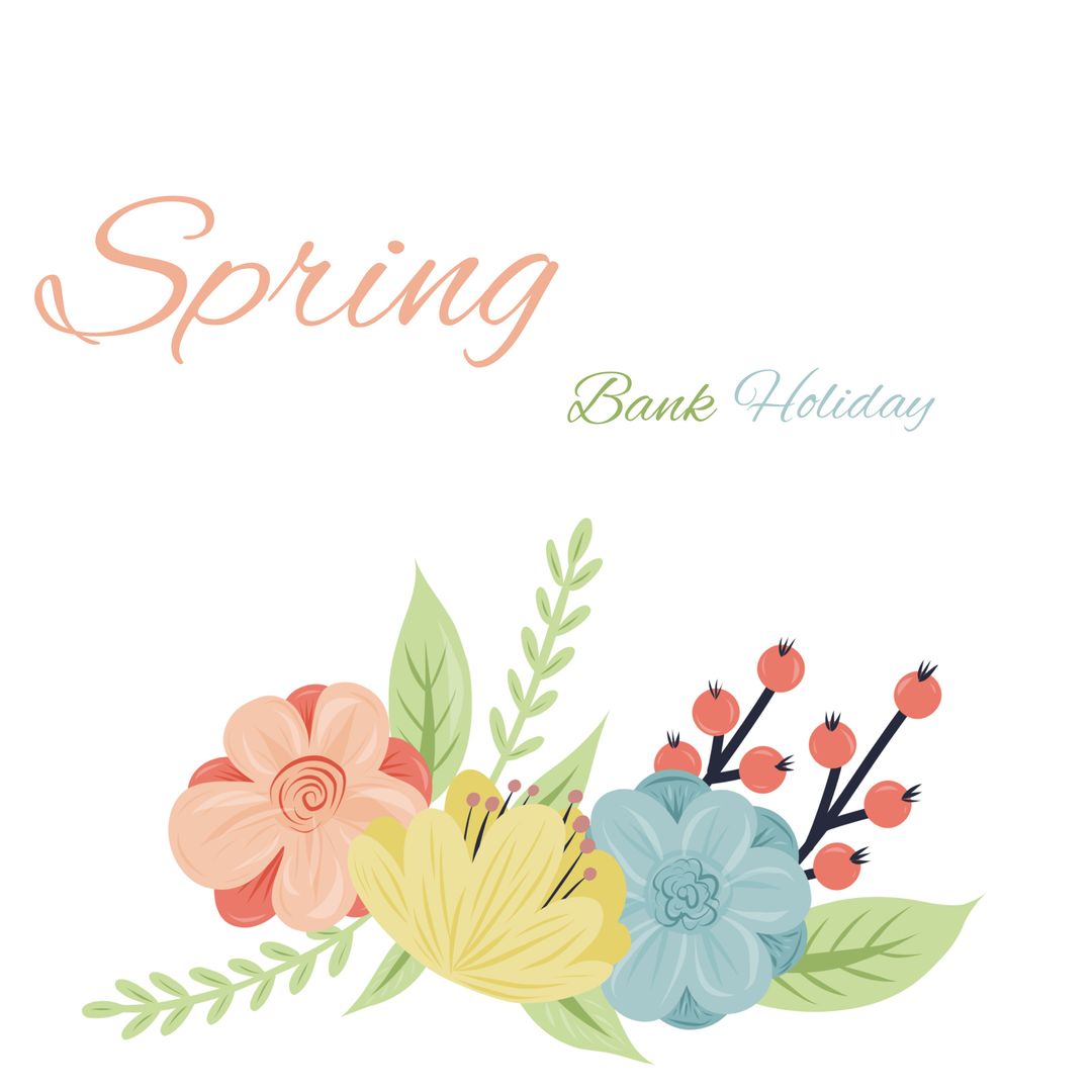 Illustrative graphic featuring delicate flowers with 'Spring Bank Holiday' text, perfect for seasonal greetings, announcements, and digital or print holiday cards. The soft color palette and elegant floral design complement seasonal event promotions and decorative projects.