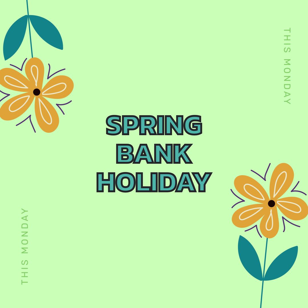 Cheerful and vibrant illustration celebrating Spring Bank Holiday features bold flowers on a green background, with 'this Monday' text providing timely relevance. Ideal for social media posts, holiday announcements, and festive newsletters.