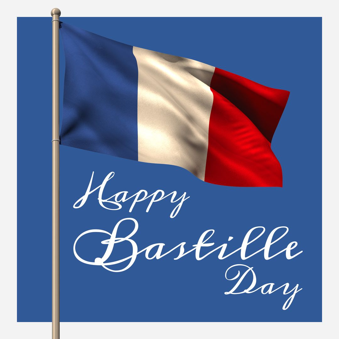Depicting the vibrant French flag against a blue background with script text wishing Happy Bastille Day. Ideal for promotional materials, advertisements, or social media posts celebrating Bastille Day, reflecting themes of patriotism and national pride.