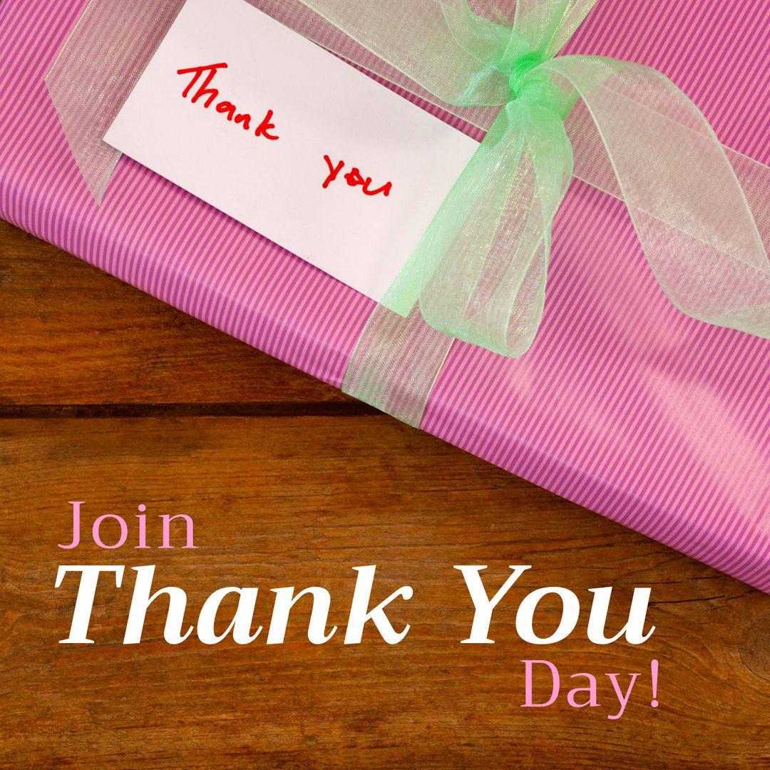 Pastel pink gift box with a green ribbon placed on a rustic wooden table background. Accompanying the box is a card reading 'Thank you' signaling appreciation and gratitude. The phrase 'Join Thank You Day!' is displayed prominently, inviting participation in expressing thanks. Useful for campaigns promoting gratitude, advertisements for holidays, or posts about appreciation events.