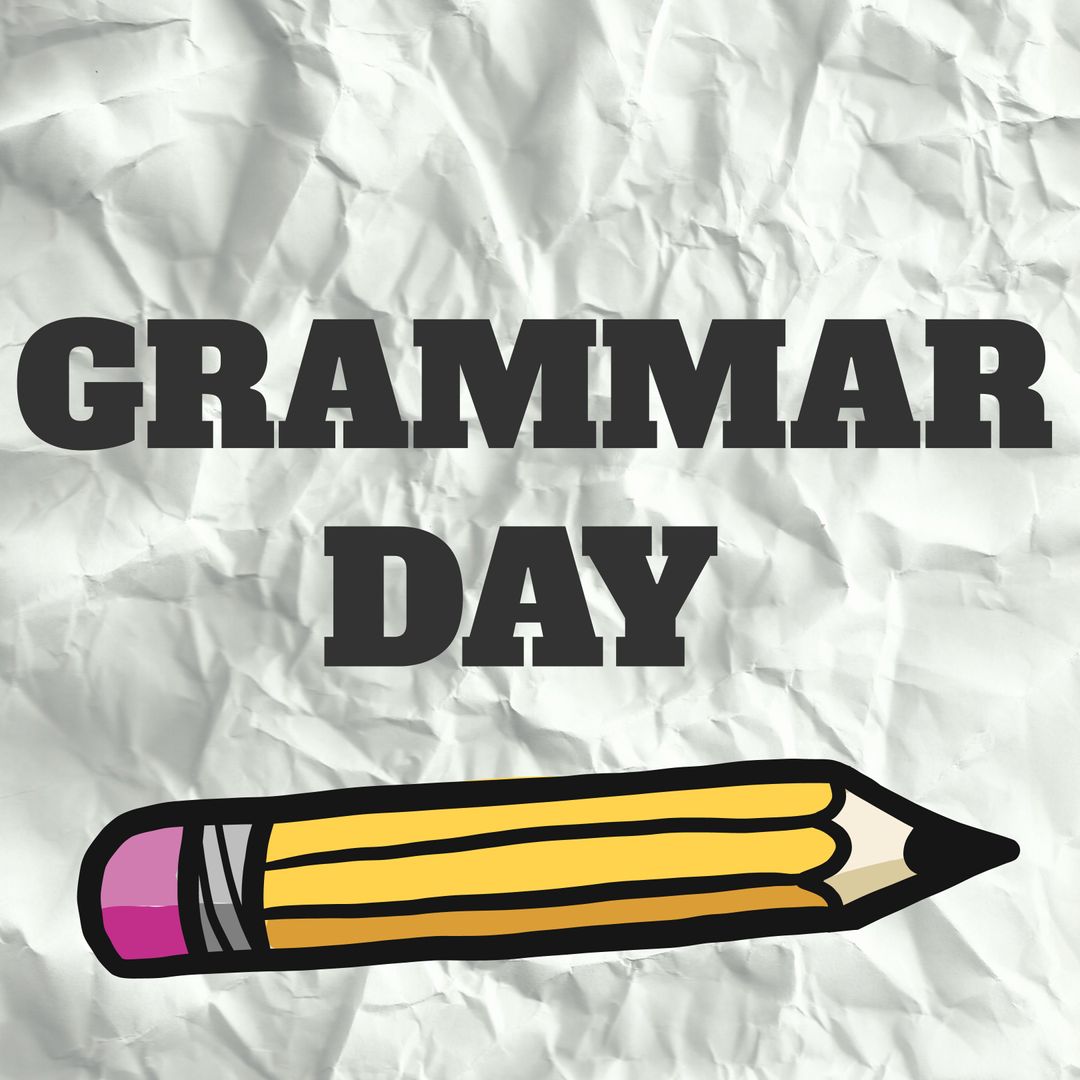 This design features a bold 'Grammar Day' text with a yellow pencil illustration on a crumpled paper background, symbolizing the editing and revision process in writing. Suitable for promotions related to writing workshops, language-focused events, educational materials, or services offering grammatical editing and proofreading. The visual theme emphasizes precision in writing and learning.