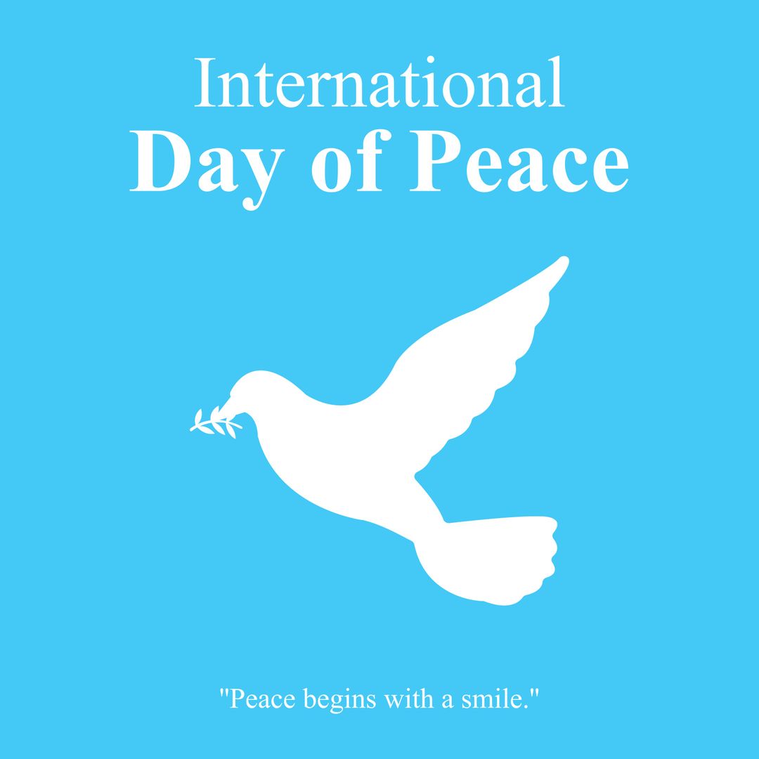White silhouette of a dove carrying an olive branch on blue backdrop symbolizes peace and tranquility. Incorporates the inspiring quote 'Peace begins with a smile.' Perfect for promoting global events, peace campaigns, anti-war initiatives, educational materials, and social media awareness posts.