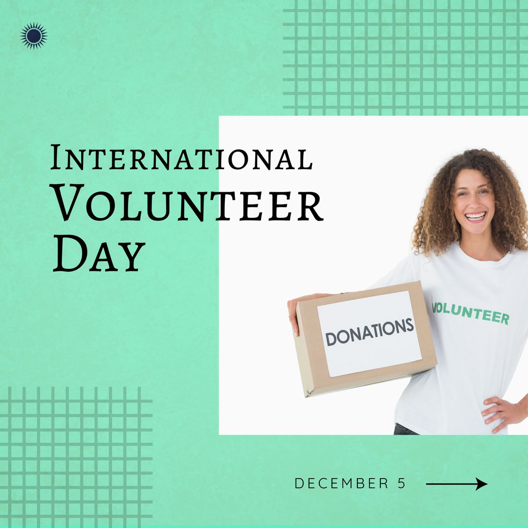 Celebrate International Volunteer Day with an uplifting image of a smiling, mixed-race woman enthusiastically holding a donations box. Perfect for campaigns promoting volunteerism, charity events, and raising awareness about global and local community involvement on December 5.