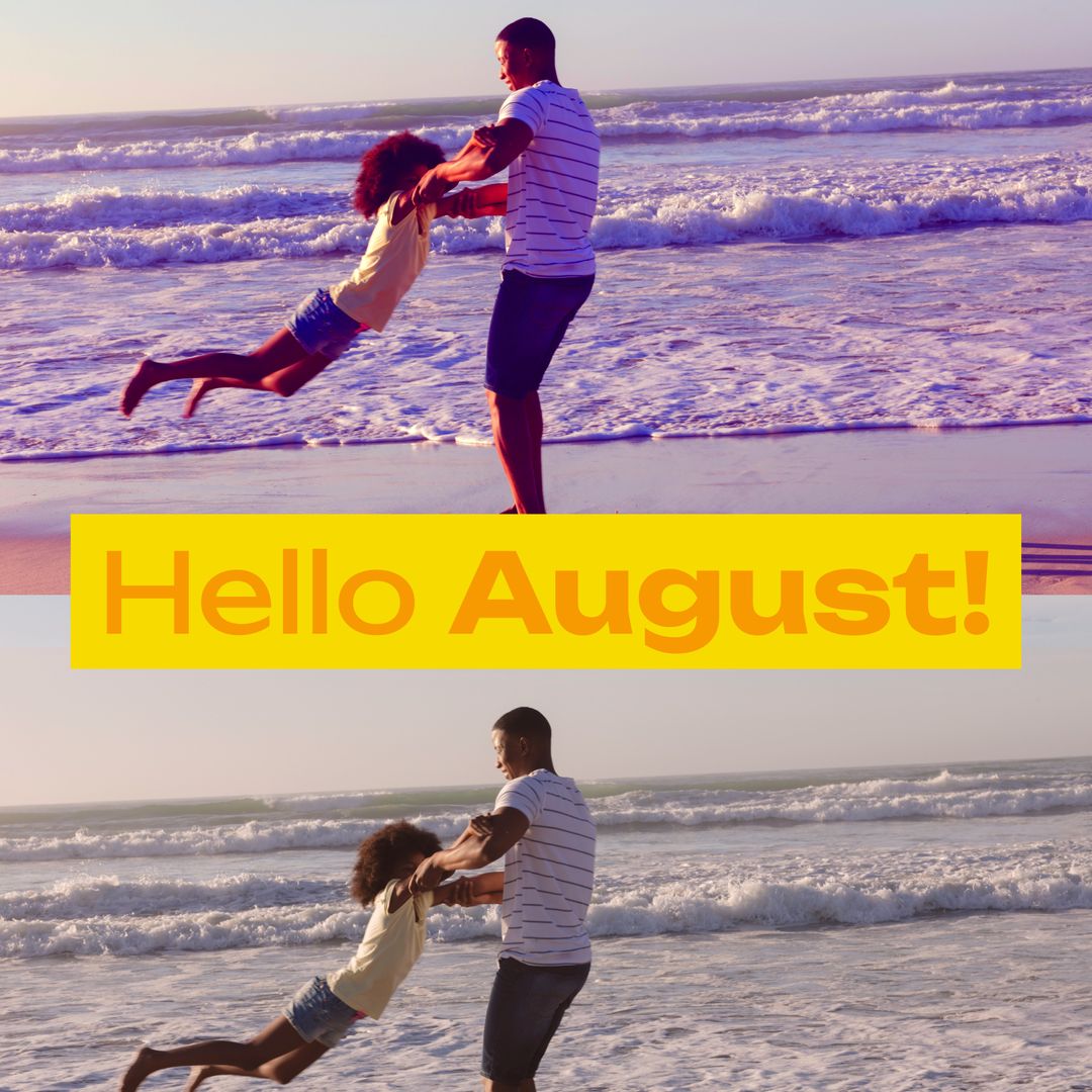 A father enjoying a sunny summer day at the beach with his daughter, spinning her around in playful happiness. Captures the warmth of family bonding and the joy of spending carefree time by the ocean in August. Suitable for use in campaigns or articles focused on family vacations, parenting, summer activities, or promotional materials for seasonal events.