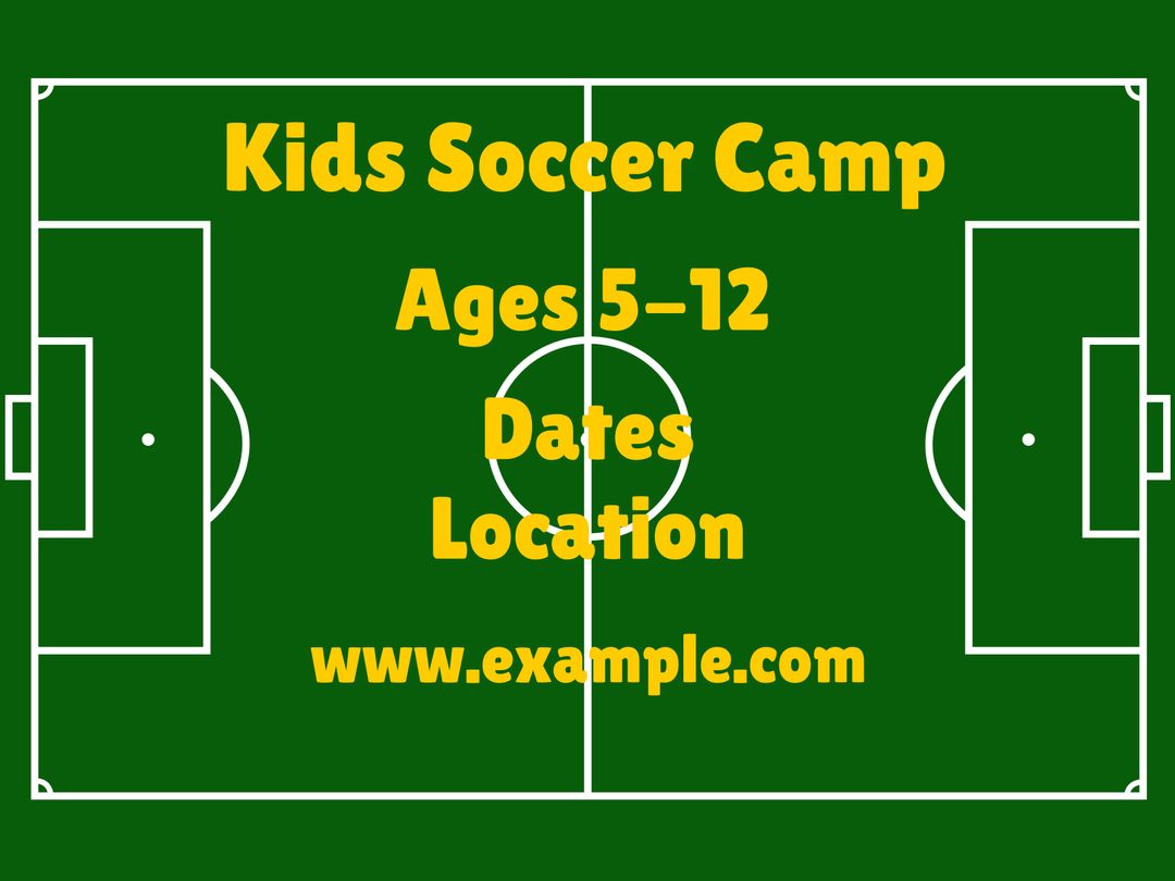 This vibrant template promotes a kids soccer camp with its appealing soccer field background. Highlighting excitement and community involvement, it is designed for event announcements, attractive marketing materials, and social media promotions. Additionally, it can be adapted for sports-themed birthday invitations or as a call-out for team sign-ups and recruiting events.