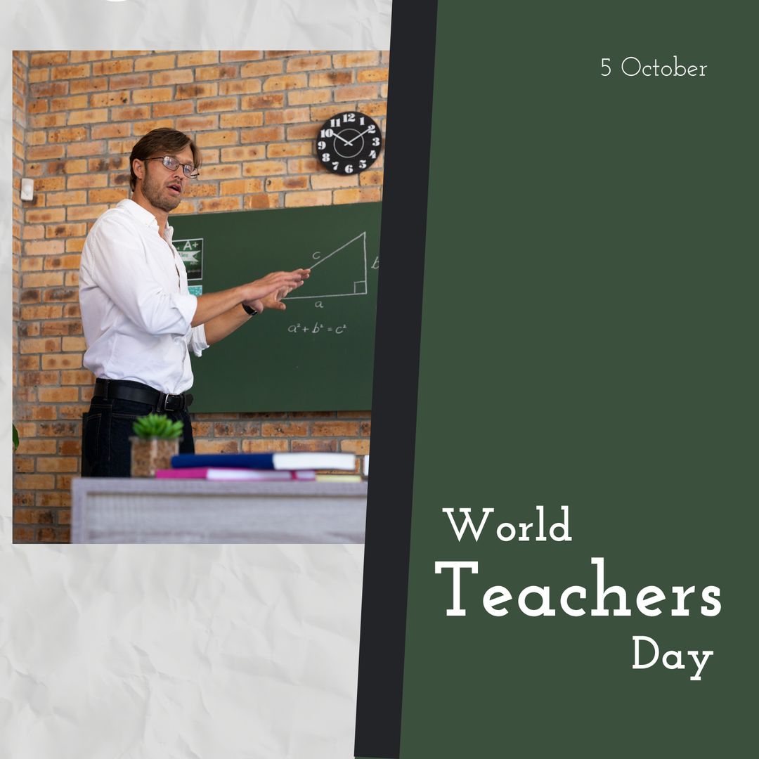 This presents a male teacher engaged in teaching, linked to the celebration of World Teachers' Day on October 5th. Perfect for education-related campaigns, awareness events, or social media posts highlighting and honoring the crucial role of teachers in society.