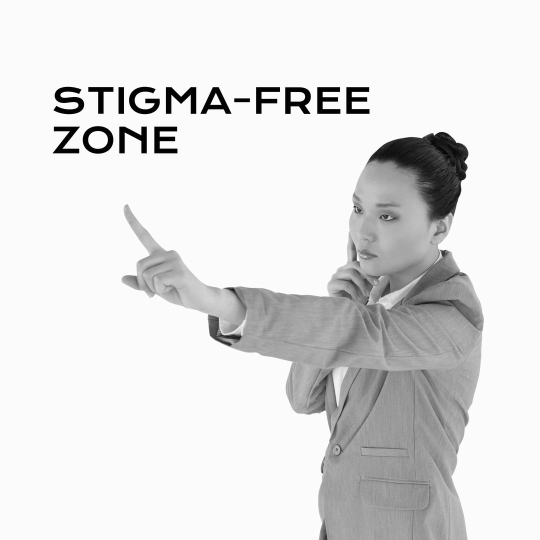 Image shows an Asian woman in business attire pointing decisively, accompanied by the text 'Stigma-Free Zone'. The theme promotes mental health awareness and combats stigma, suggesting a professional yet compassionate approach to advocacy. Ideal for use in educational materials, corporate training, and social campaigns that champion supportive and inclusive work environments.