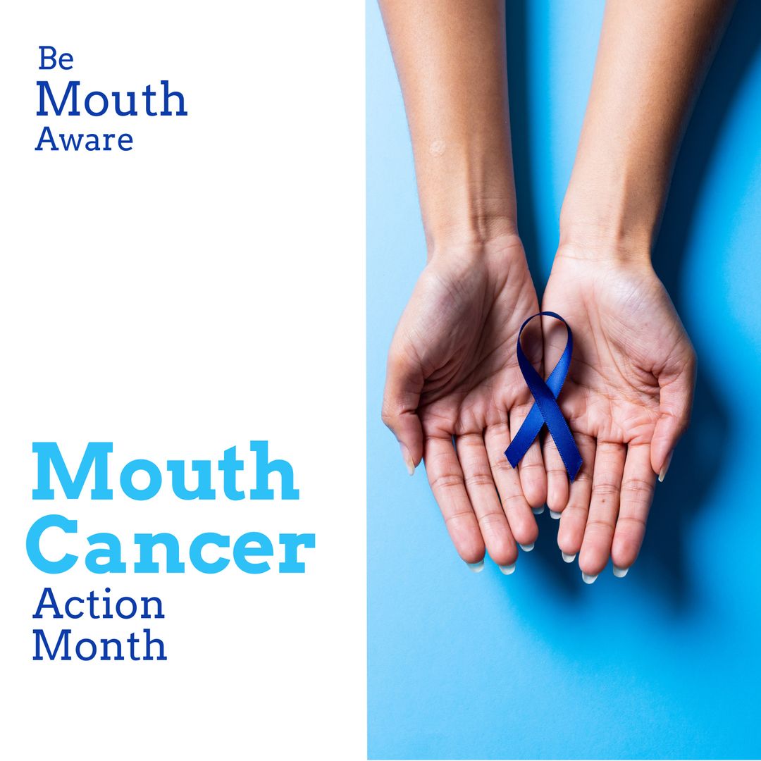 Visual highlighting Mouth Cancer Action Month with hands offering a blue ribbon, symbolizing awareness and support. Useful for health campaigns, educational materials, and promoting awareness activities within communities.