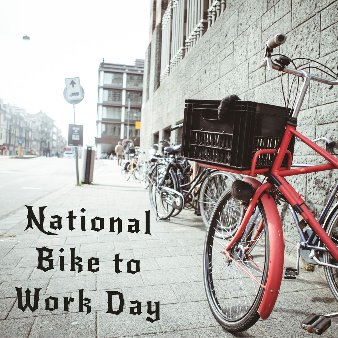 This depiction of bicycles lined up along a city street paired with text promoting National Bike to Work Day champions sustainable and eco-friendly commuting. Perfect for campaigns focused on encouraging cycling, promoting green initiatives, and raising awareness for healthy, sustainable urban travel.