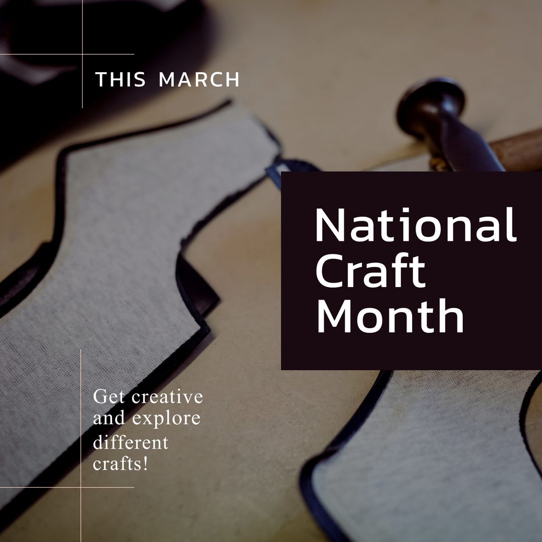 National Craft Month invitation highlighting leather cuts and tools encouraging creativity and exploration in crafting. Ideal for promoting handcraft events, inspirational DIY projects, and artisan workshops during March to encourage engagement with crafting communities.