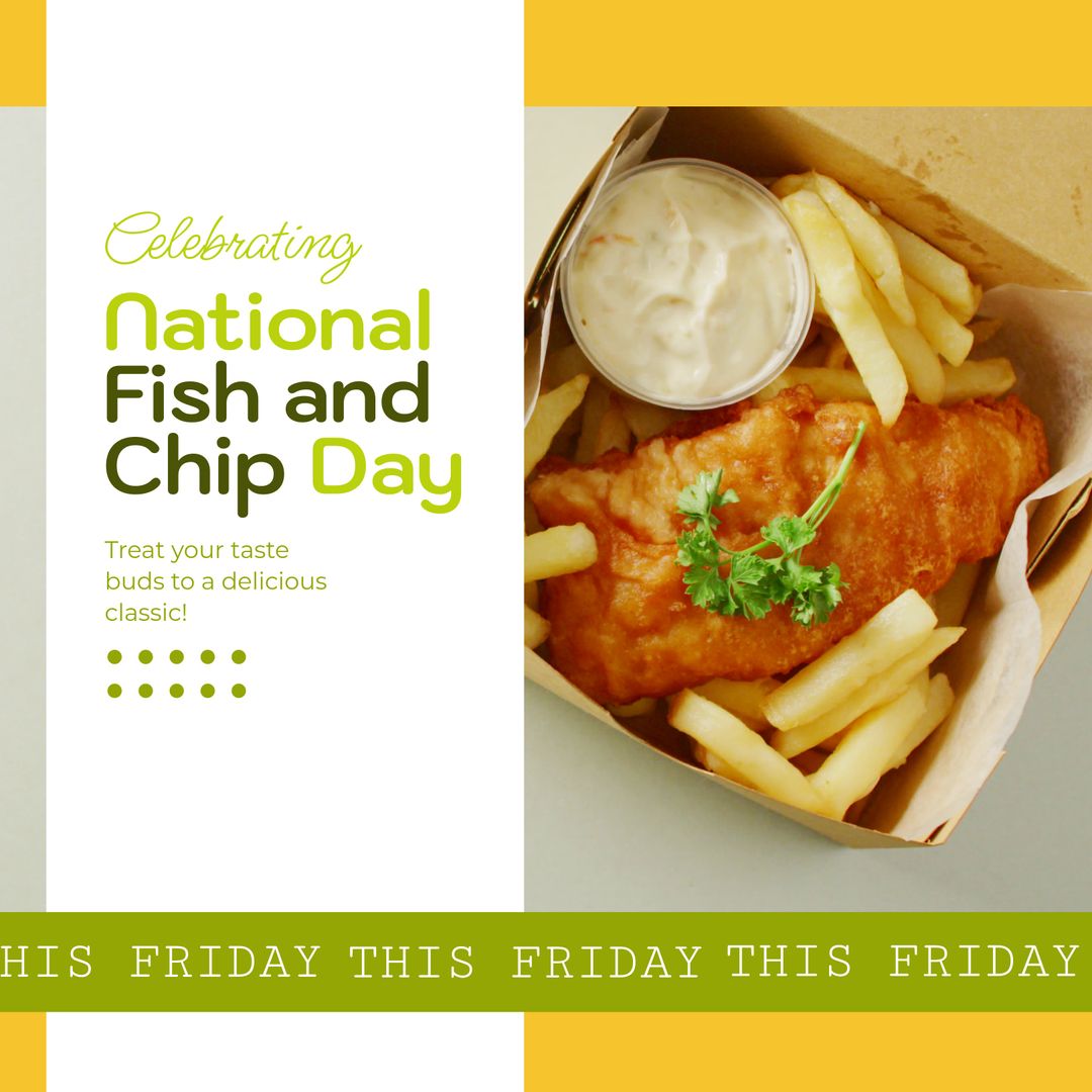 Promotional design features enticing fish and chips arrangement to celebrate National Fish and Chip Day. Perfect for restaurant advertising, digital marketing, social media promotions, or event posters to attract food lovers with promises of a classic, savory dish.