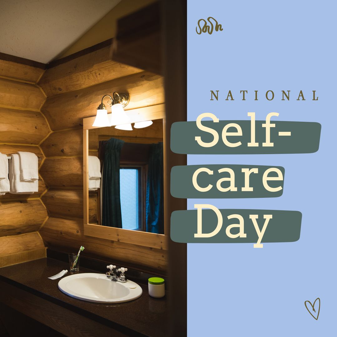 Cozy wooden bathroom serves as soothing background for National Self-Care Day message. Enhances concept of personal growth and wellness. Perfect for wellness campaigns and lifestyle blogs promoting relaxation routines.