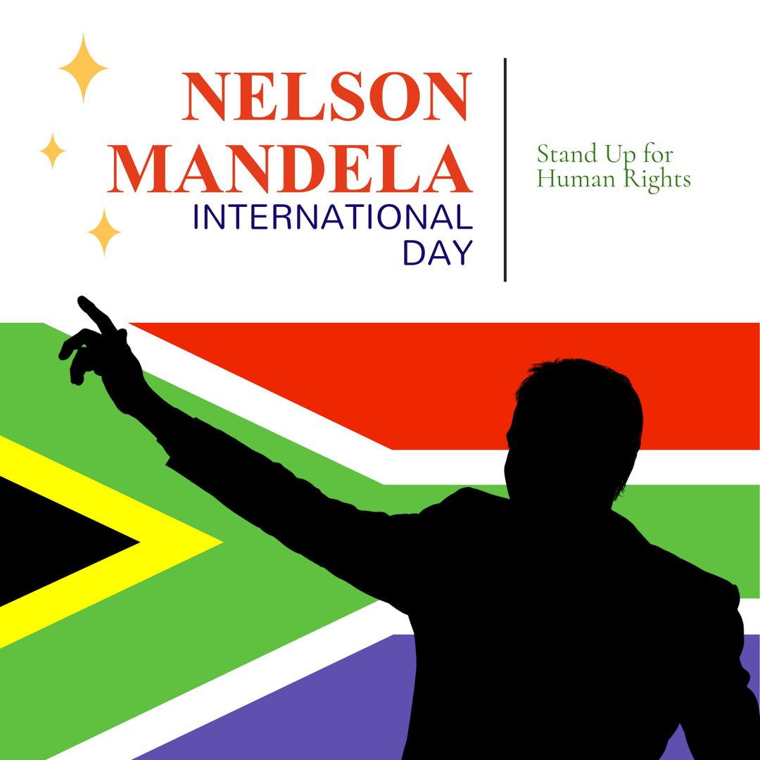 Commemorating Nelson Mandela Day with a silhouette of a man in front of the vibrant South African flag signifies a dedication to human rights and racial equality. The image can be used to promote events on Nelson Mandela Day, educational materials about South African history, social media campaigns focused on equality and independence, or articles celebrating Mandela's legacy and contribution to global justice.