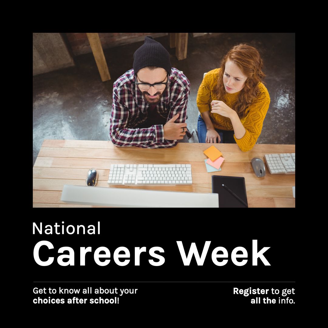 Two professionals are seen sitting at a wooden desk, engaging in a focused discussion in an office environment. They appear to be collaborating on strategies or ideas, possibly related to roles for National Careers Week. Ideal for illustrating career workshops, team meetings, or educational promotions centered around professional growth and workplace collaboration.
