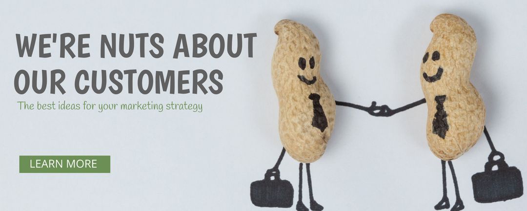 Image features two peanuts wearing drawn suits shaking hands, illustrating customer appreciation with humor. Perfect for business loyalty programs, partnership announcements, or promoting networking events. Can be used creatively in marketing campaigns to highlight strong relationships and collaborative efforts.