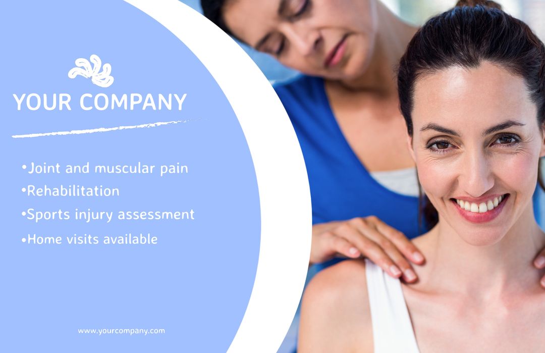 Promoting wellness and physiotherapy services, featuring a smiling woman, this visually appealing composition evokes trust and support in recovery. Ideal for advertising healthcare clinics and physiotherapy centers, it can be used effectively in flyers, social media posts, and online ads for wellness programs. Perfect for showcasing services aimed at providing relief from joint and muscular pain, rehabilitation, and injury assessments.
