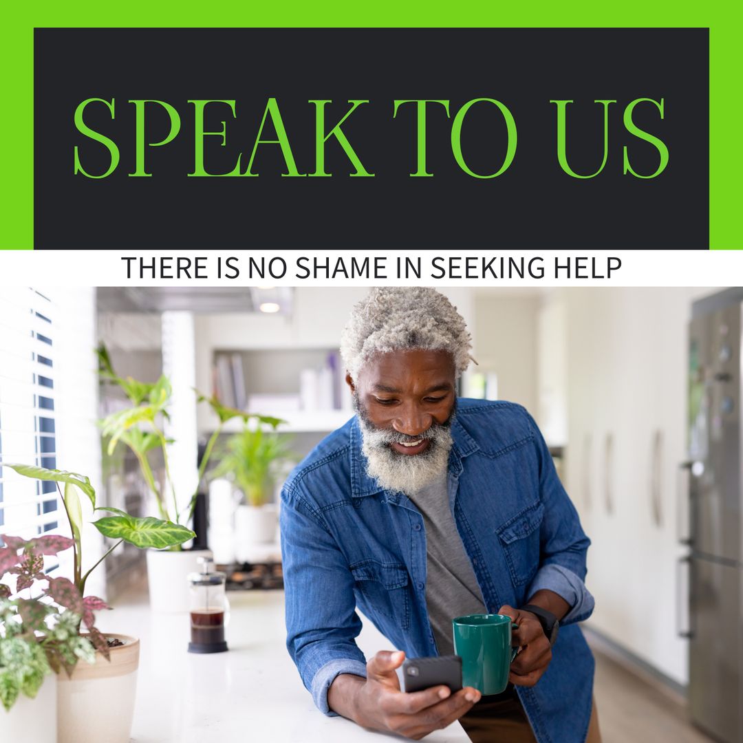 Image shows senior African American man in casual shirt holding smartphone with cup of tea, symbolizing reaching out for mental health support. Conceptualizes finding help through digital communication, ideal for promoting mental health awareness, support networks, digital therapy services.
