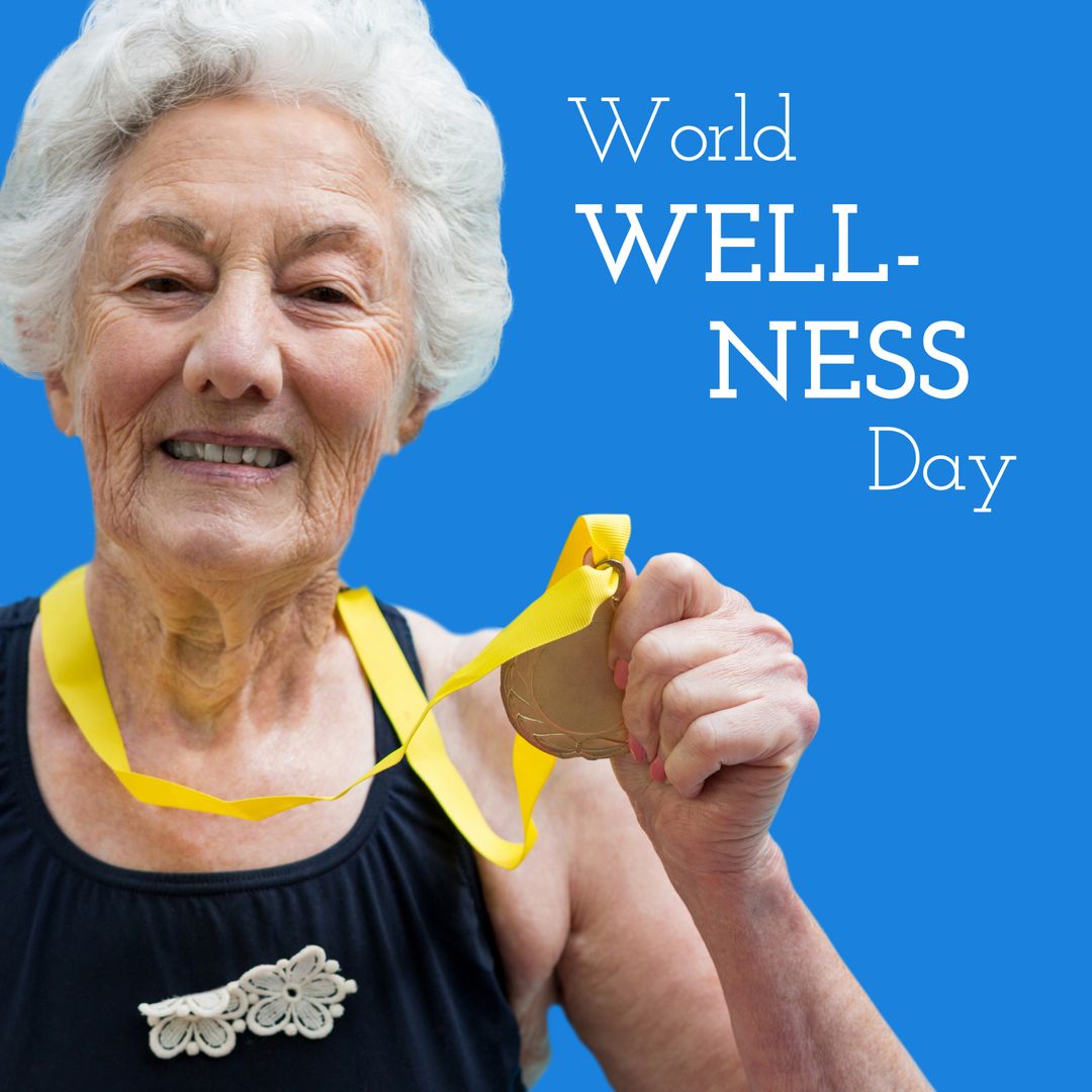 - Senior Woman Celebrating on World Wellness Day with Medal