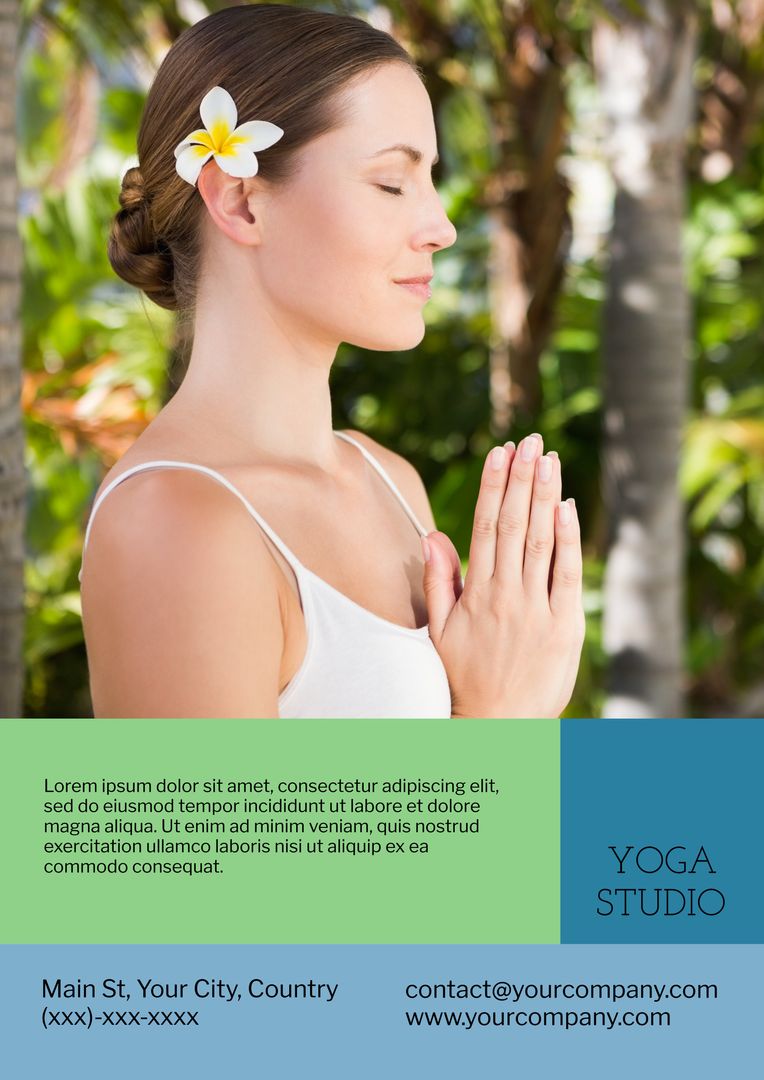 Serene Woman Practicing Yoga with Tropical Flower for Wellness Promotion Template