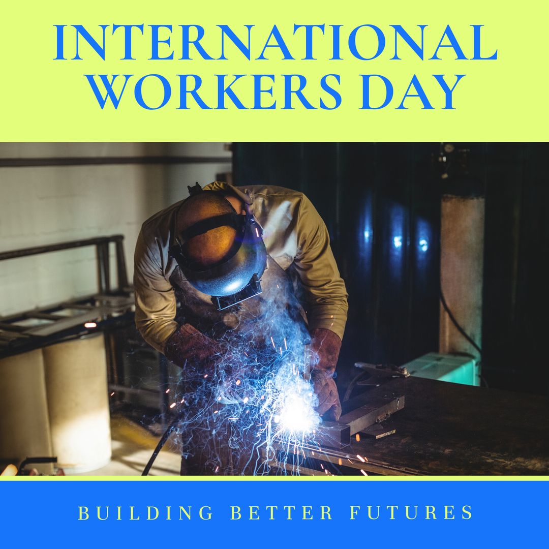 Featured is a skilled welder wearing protective gear, actively engaging with welding equipment, emitting bright sparks in a workshop. Captioned for International Workers Day, emphasizing labor and the industrial workforce. Useful for content focusing on labor rights, skilled trades recognition, celebrating International Workers Day, or magazines highlighting industrial achievements.