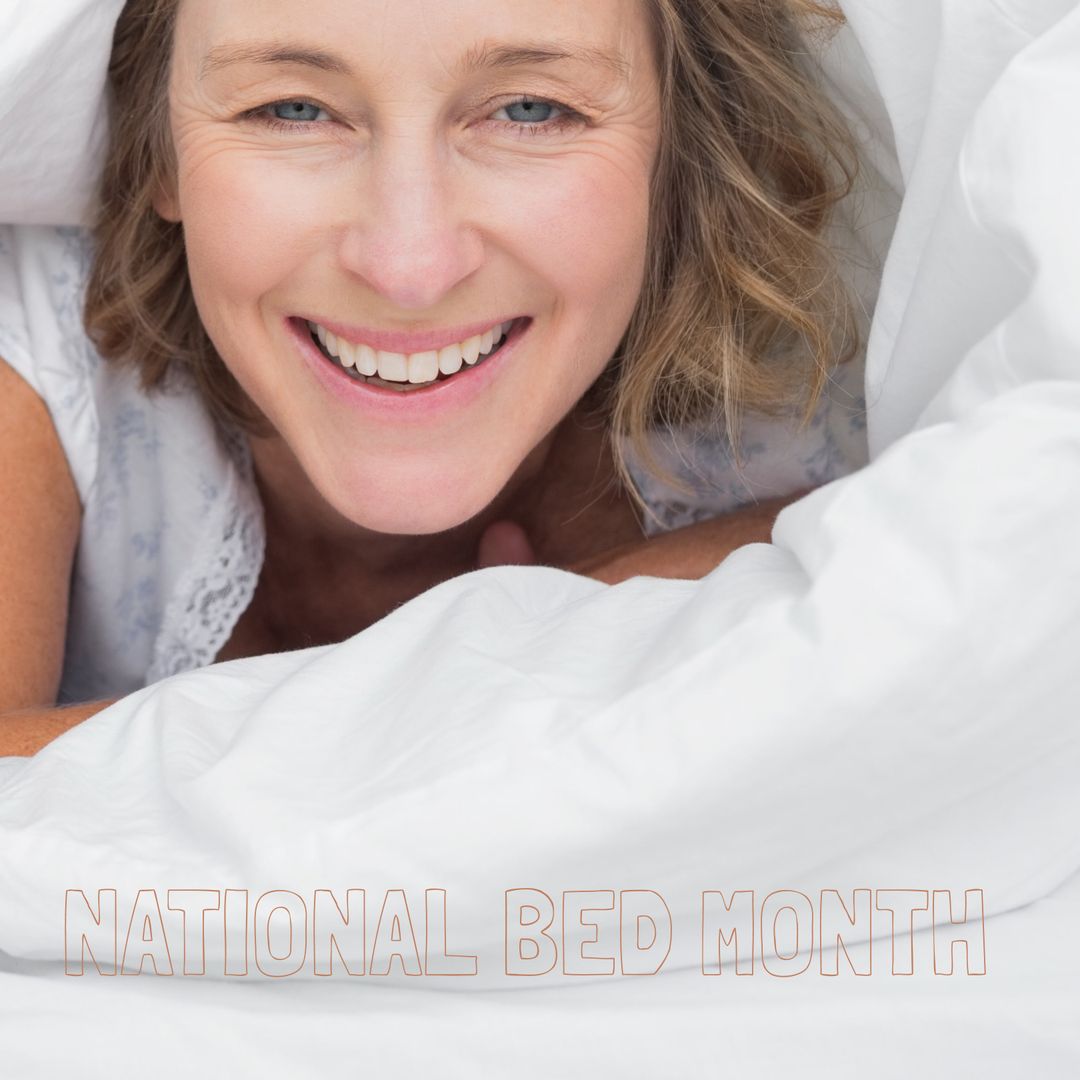 Celebrating comfort and relaxation, this smiling woman in cozy bed linens embodies the joy of National Bed Month. Perfect for promoting sleep awareness, bedding sales, or wellness content focused on relaxation and better sleep habits.