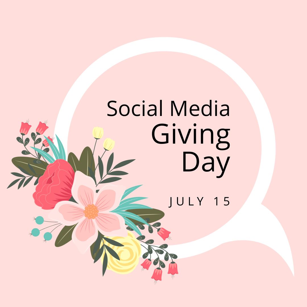 This illustration highlights Social Media Giving Day on July 15, featuring cheerful floral patterns and a speech bubble design. Ideal for promoting online fundraising events, charity initiatives, or social media awareness campaigns. The pastel pink background and vibrant flowers convey a sense of positivity and community involvement.