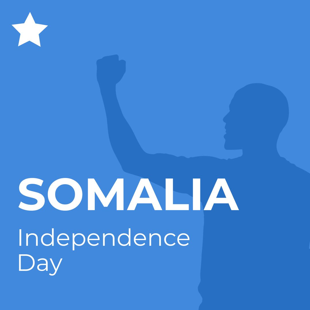 Silhouette of a man seen celebrating against a blue background with text honoring Somalia Independence Day. The image is suitable for promoting cultural and patriotic events, educational materials about Somalia, and social media posts engaging Somali communities around their independence celebrations.