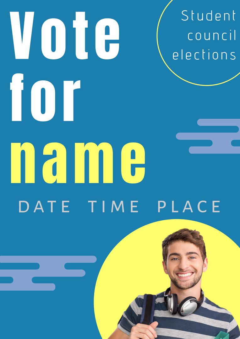 Eye-catching promotional poster for student council elections featuring a smiling male student. Displayed with clear text on a vibrant blue background, easy to customize for date, time, and place details. Ideal for schools, universities, and educational campaigns seeking to motivate student participation and engagement in student government activities.