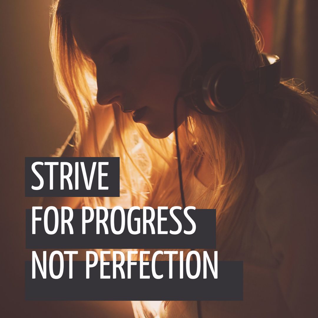A contemplative woman with headphones alongside an inspiring quote about striving for progress, not perfection. Ideal for materials promoting self-improvement, mindfulness, and personal development workshops. Perfect for online courses, social media posts, and inspirational content aimed at encouraging reflection and positive change.