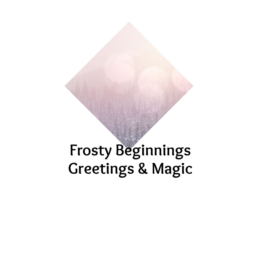 Design features snowy winter landscape set in diamond shape with overlay of text 'Frosty Beginnings, Greetings & Magic'. Captures essence of winter's charm and magic. Perfect for designing festive greeting cards, seasonal promotions, or digital invitations conveying holiday spirit.