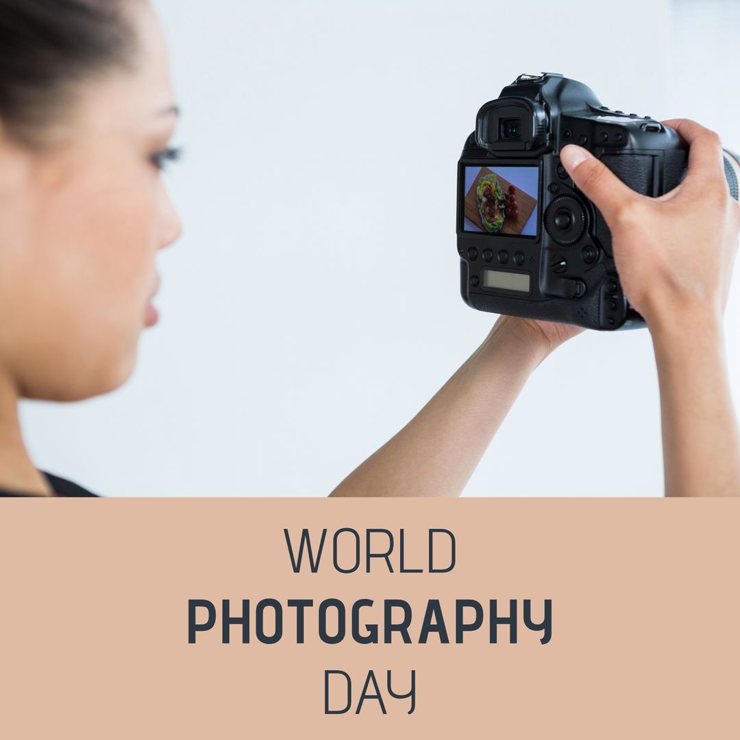 Image features woman examining a photograph on camera display, highlighting celebration of World Photography Day. Suitable for promotions related to photography events, creativity awareness campaigns, articles on photography techniques, or blogs focused on global observances.