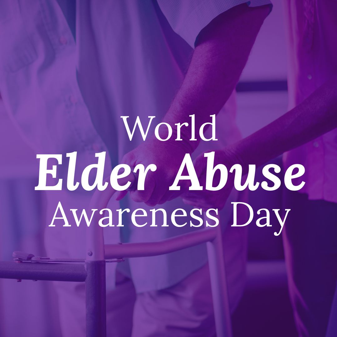 Digital display of World Elder Abuse Awareness Day text highlighting importance of supporting and protecting elders. Showing two people with walker in hospital symbolizing care. Useful for promoting awareness events, social media campaigns or informational materials emphasizing prevention and support for elder abuse.