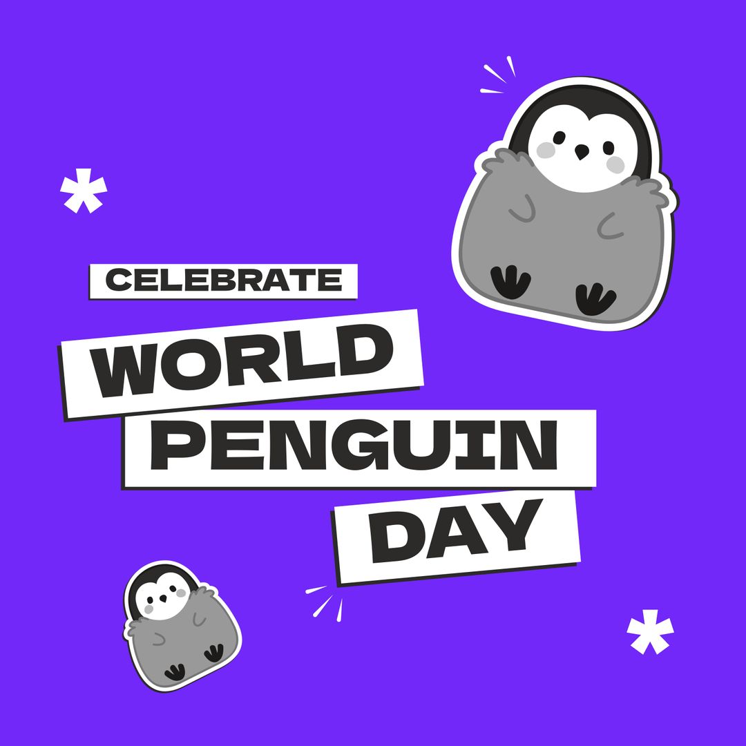This cheerful design features adorable penguin illustrations on a vibrant purple background, celebrating World Penguin Day. It is ideal for event promotions, nature awareness campaigns, social media posts highlighting wildlife conservation, and educational content about penguin habitats.