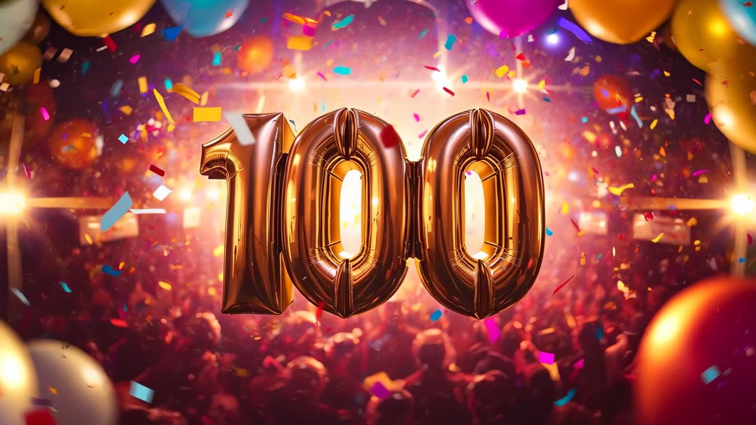 - 100 Metallic Balloons Floating Over Cheering Crowd with Confetti Shower Celebrating Milestone