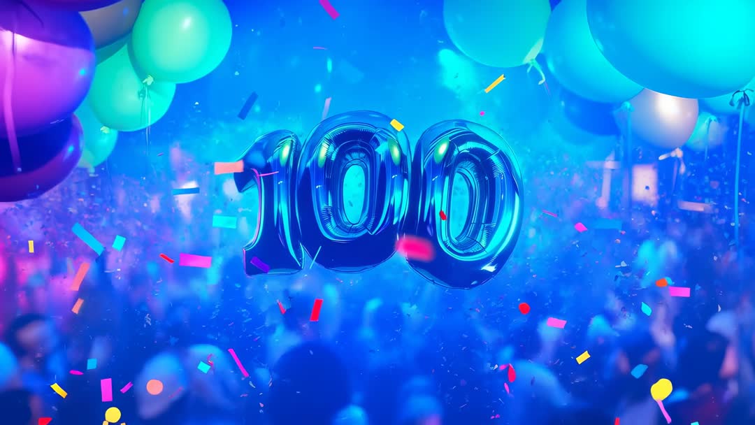 - 100th milestone celebration video with metallic 100 balloon floating through neon crowd