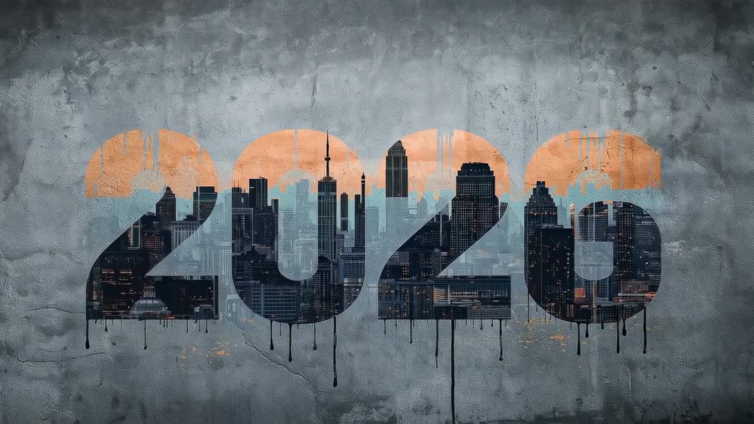 AI Generated Video. Video footage showing large 2020 numerals painted on concrete wall while city skyline silhouette is appearing inside numbers with warm orange glow bleeding from behind. Paint drips and rough wall texture are creating gritty street art aesthetic. Progressive reveal effect is making numerals brighten and skyline become clearer across frames, offering cinematic transition for edits. Composition is providing wide negative space for title and lower third graphics, and strong central element for logo placement. Working well for New Year recaps, year-in-review pieces, urban culture stories, event promos, music video intros, social media countdowns, and documentary openers. Designers are using footage for background layers, motion graphic overlays, poster art, gallery promos, and editorial cover visuals. Color palette is pairing well with monochrome typography and warm accent colors. Delivery suggestions: using slow crossfade or stencil wipe to emphasize reveal, adding ambient synth score for cinematic mood, placing text captions in upper third to preserve skyline detail, and applying subtle parallax for depth in motion graphics.