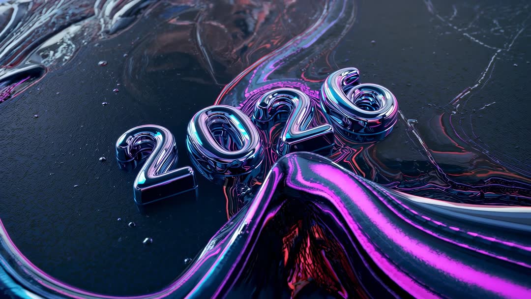 AI Generated Video. Featuring chrome 2026 digits flowing across glossy dark plane, with neon magenta and cyan liquid forming reflective wave and highlighting metallic curves. Capturing closeup studio lighting, high contrast reflections, and smooth liquid motion for cinematic futuristic look. Ideal for New Year countdowns, tech brand promos, event openers, music visuals, title sequences, social media clips, website hero loops. Providing looping-friendly composition, clear center focus, and dramatic color contrast for headline animation, banner design, broadcast graphics, digital campaigns. Delivering modern sci-fi aesthetic, high-impact brand communication, and versatile background for product reveals and motion design experiments. Originating from AI generated rendering, offering unique abstract visual language for futuristic campaigns and experimental visuals.