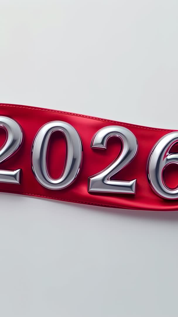 AI Generated Video. Showcasing chrome 2026 numerals on flowing red satin ribbon, catching shifting highlights and reflective glints on smooth tabletop. Vertical format working great for social media reels and stories, New Year countdown clips, event promos, and digital greeting cards. Closeup composition creating strong focal point for headline text or logo overlay. Metallic sheen and satin texture adding premium, festive mood suitable for luxury brands, holiday campaigns, party invitations, and retail signage. Use looping motion or subtle camera pan to extend duration, add animated sparkle and bold typography for CTA, or combine with countdown timer for celebratory reveal. High contrast space above and below providing room for copy and branding.